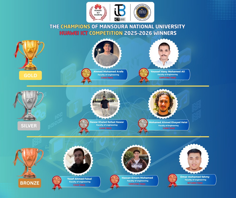 حصدت جامعة المنصورة الأهلية في انجاز تاريخي محقق جامعة المنصورة الأهلية الذهبية والفضية والبرونزية علي مستوي المنافسه الوطنية ضمن مشاركة طلاب من أكتر من 70 جامعة مصرية حكومية و أهلية و خاصة في مسابقة هواوي لتكنولوجيا المعلومات والاتصالات Huawei ICT 2026 ..