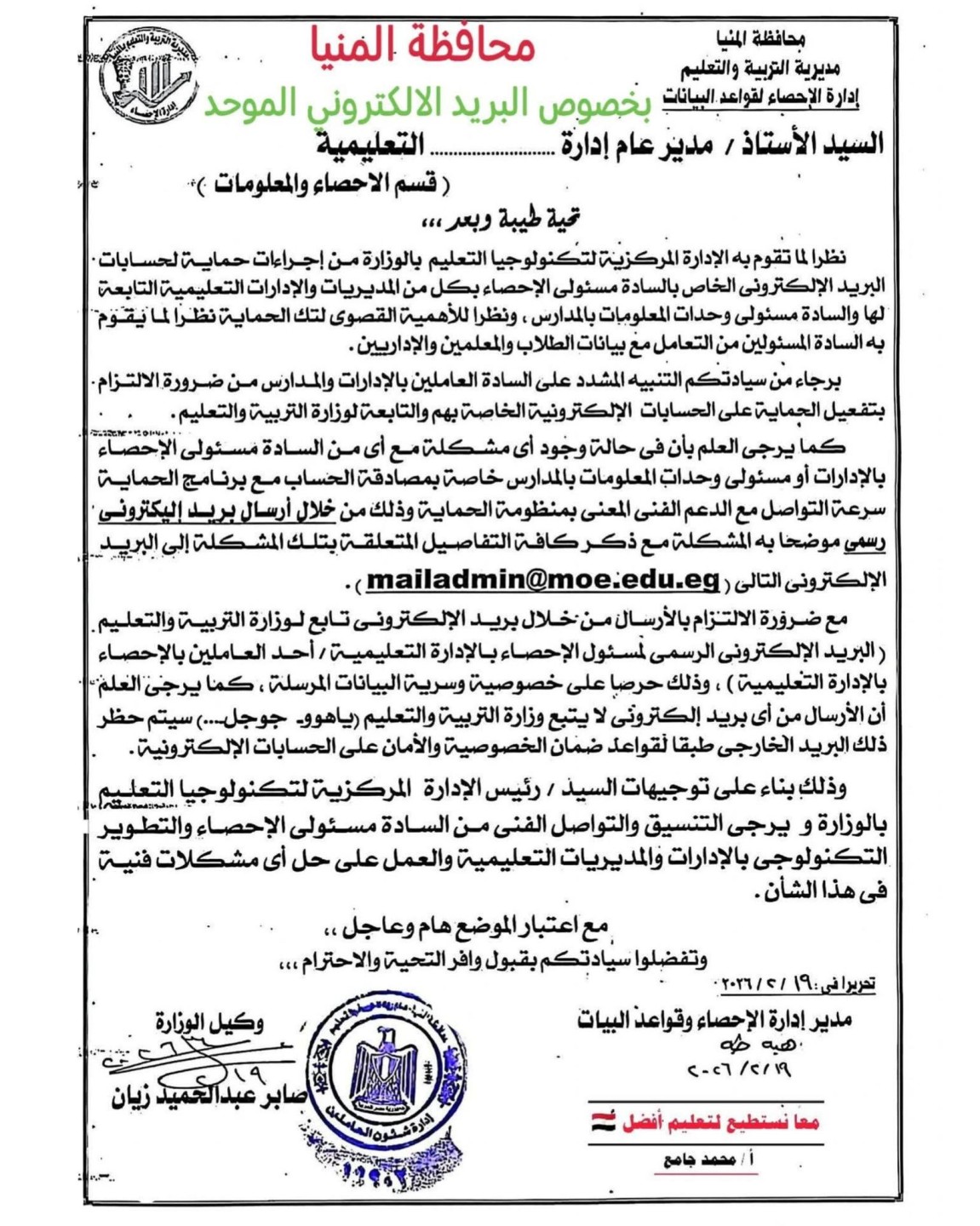 تلقت المدارس والإدارات التعليمية تعليمات عاجلة من وزارة التربية والتعليم والتعليم الفني ، بضرورة الإلتزام بتفعيل الحماية على الحسابات الإلكترونية التابعة لوزارة التربية والتعليم ، و الخاصة بمسئولي الإحصاء بالمديريات والإدارات التعليمية ، ومسئولي وحدات المعلومات بالمدارس ، لحماية بيانات الطلاب والمعلمين والإداريين .