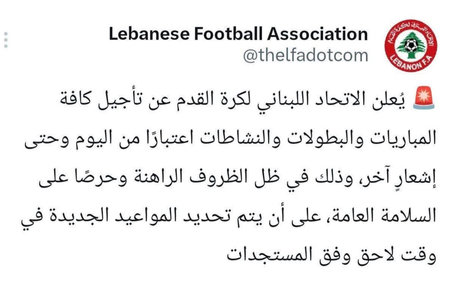 اعلن الاتحاد اللبناني لكرة القدم تأجيل كافة مباريات الدوري والأنشطة والبطولات من اليوم لحين إشعار آخر بسبب الظروف الراهنة في المنطقة .
