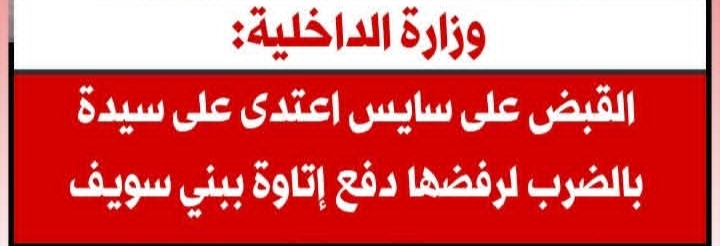 أعلنت وزارة الداخلية أنه في إطار كشف ملابسات منشور مدعوم بصور ومقطع فيديو تم تداوله عبر أحد الحسابات الشخصية على مواقع التواصل الاجتماعي، تضمن تضرر سيدة من قيام منادي سيارات بالتعدي عليها بالضرب وإحداث إصابتها بمحافظة بني سويف.