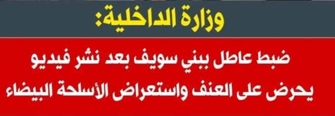 أعلنت وزارة الداخلية عن ضبط عاطل مقيم بمحافظة بني سويف، بعدما تداول مقطع فيديو وصورة عبر أحد حساباته على مواقع التواصل الاجتماعي تتضمن التحريض على العنف والبلطجة بصورة تتنافى مع القيم المجتمعية، حيث ظهر خلالها حاملًا أسلحة بيضاء.