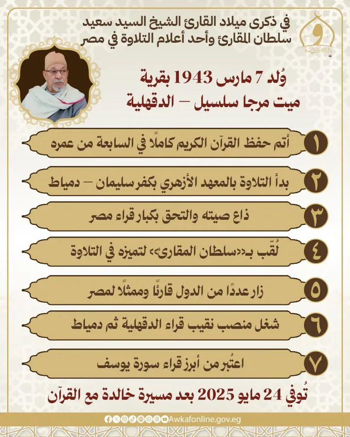 تحيي وزارة الأوقاف اليوم ذكرى ميلاد القارئ الشيخ السيد سعيد، أحد أعلام تلاوة وتجويد القرآن الكريم في مصر والعالم الإسلامي، الذي وُلد في مثل هذا اليوم 7 مارس 1943م، بقرية ميت مرجا سلسيل التابعة لمركز الجمالية بمحافظة الدقهلية، ونبغ في قراءة وتجويد القرآن الكريم حتى لُقّب بـ«سلطان المقارئ»، لما تميز به من صوت خاشع وأداء متقن ترك أثرًا بالغًا في نفوس مستمعيه.