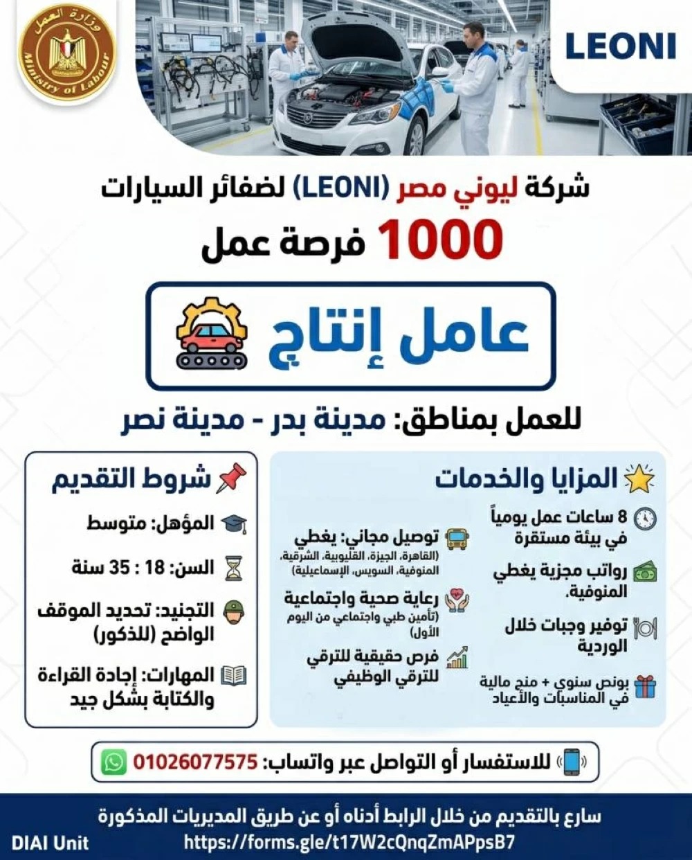 وأعلنت وزارة العمل عن توافر 1000 فرصة عمل جديدة بوظيفة عامل إنتاج داخل شركة ليوني المتخصصة في تصنيع ضفائر السيارات، وذلك ضمن جهود الوزارة لتوفير فرص عمل للشباب بالتعاون مع كبرى الشركات الصناعية، مع تقديم عدد من المزايا الوظيفية إلى جانب الرواتب والتأمينات.