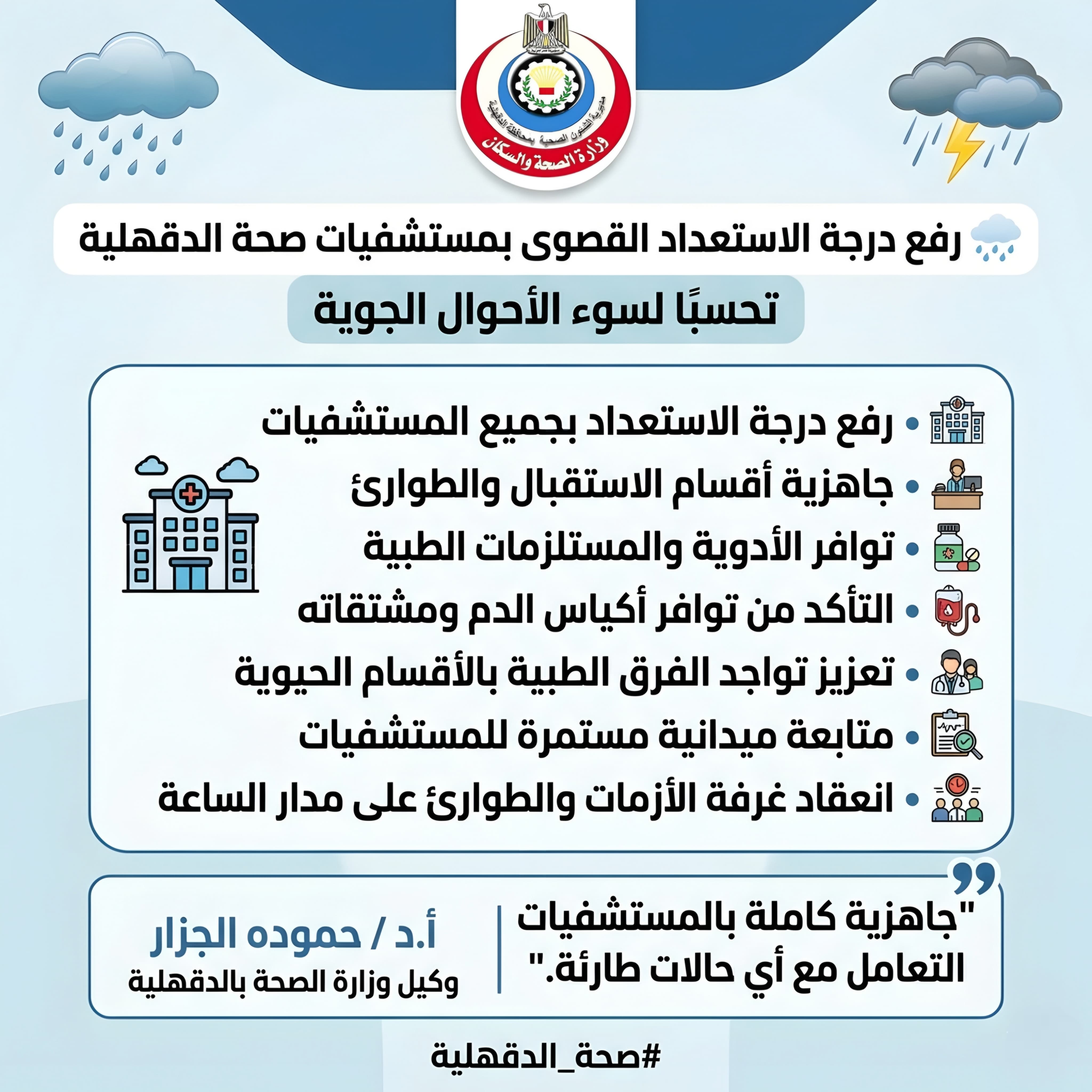 صحة الدقهلية ترفع درجة الاستعداد القصوى بالمستشفيات تحسبًا لسوء الأحوال الجوية