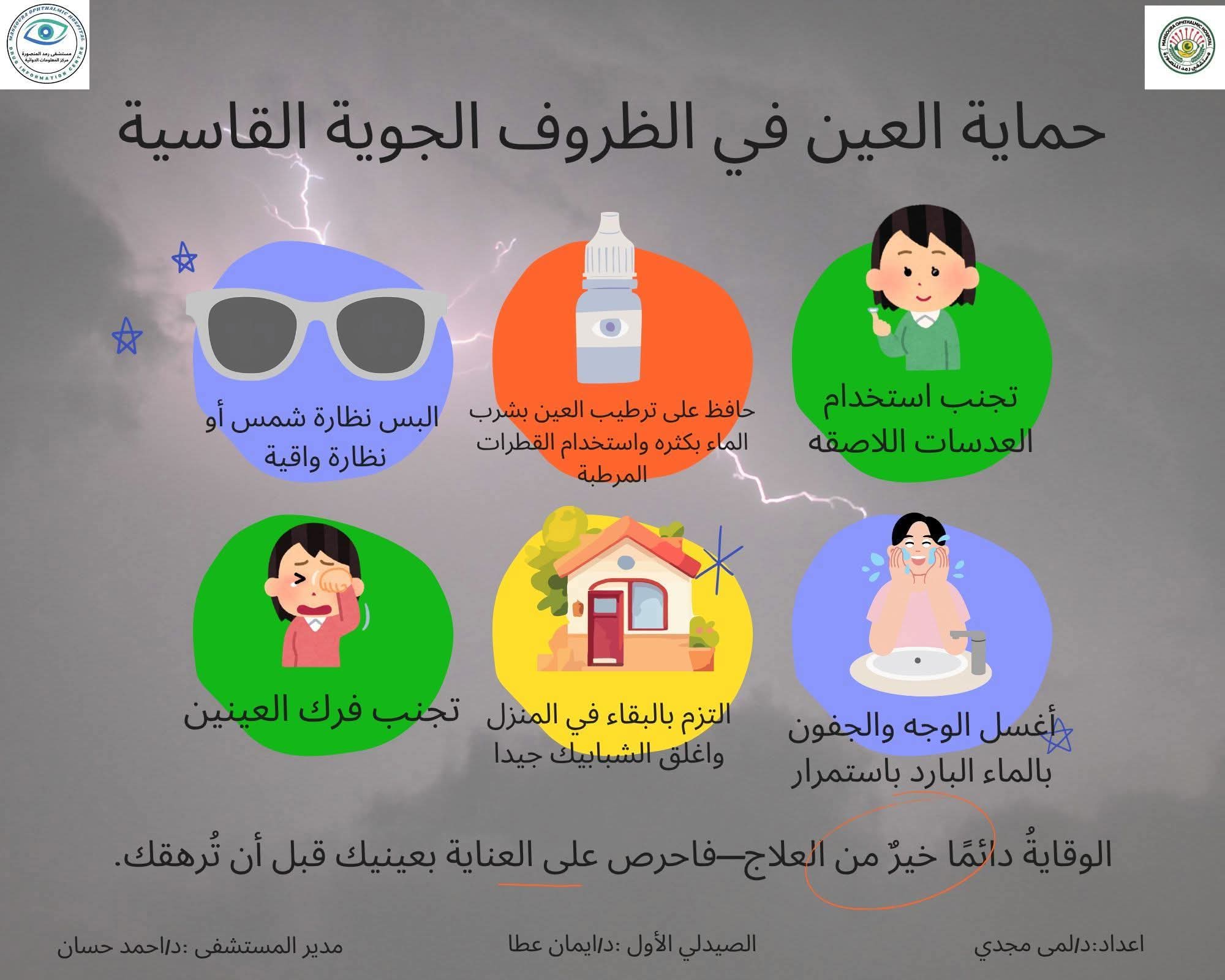 صرح الدكتور أحمد عوض حسان مدير عام مستشفي رمد المنصورة ان هناك ٦ نصائح لحماية عينيك من التقلبات الجوية والأتربة ..