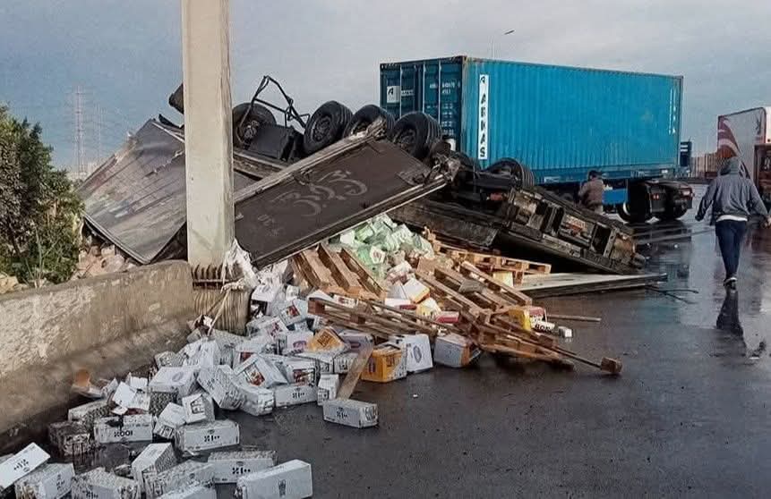 انقلاب سيارة محملة بالبضائع في حادث على طريق الواحات بسبب الطقس