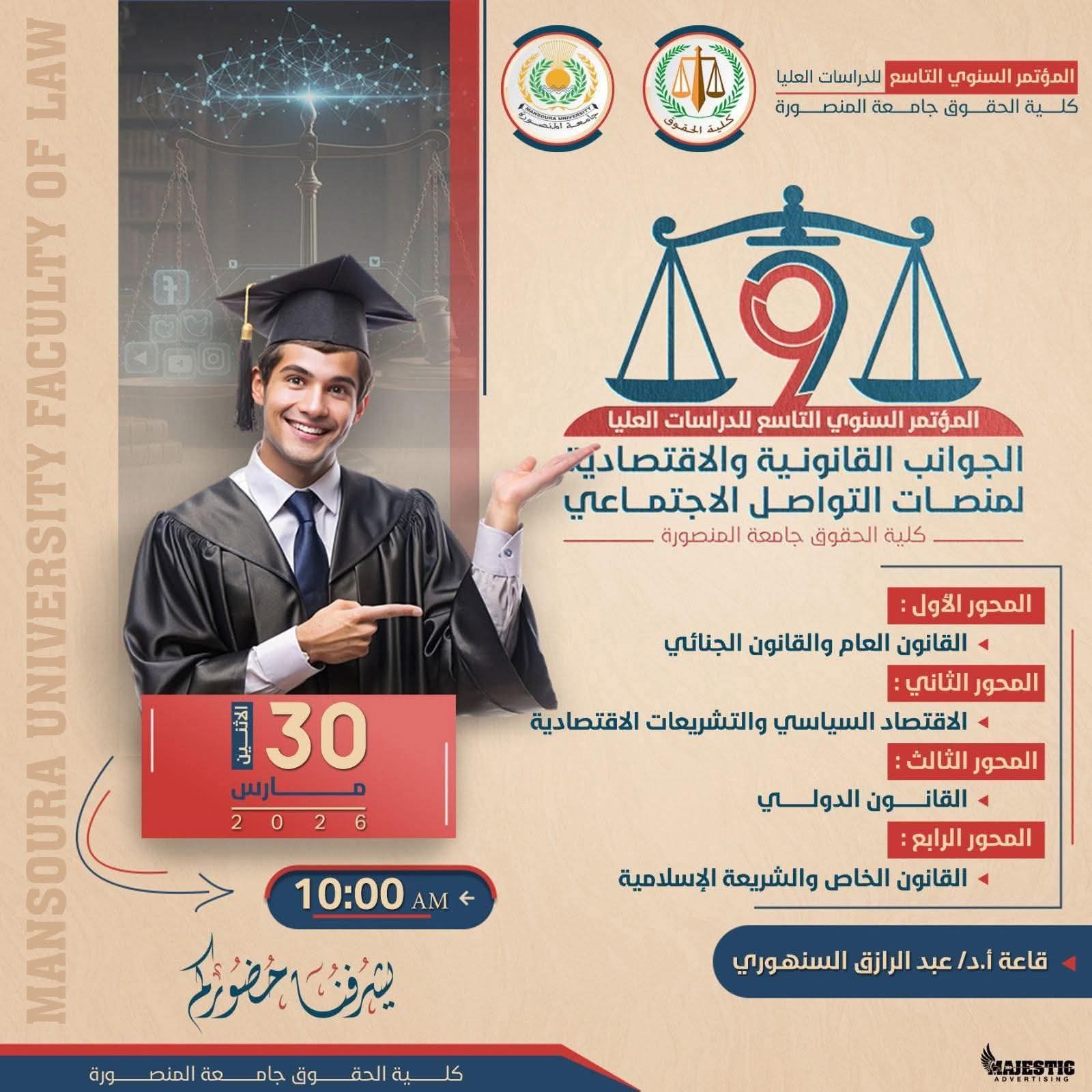 وتنظيم الدكتور إبراهيم عبد الله عبد الرؤوف وكيل الكلية لشؤون الدراسات العليا والبحوث .. وتستعد كلية الحقوق بجامعة المنصورة لتنظيم المؤتمر السنوي التاسع للدراسات العليا ..