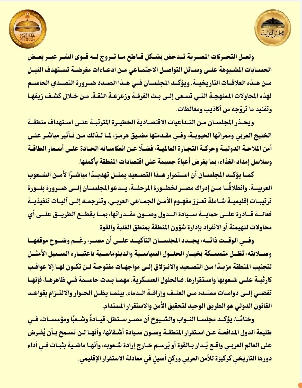 استمرار التصعيد يمثل تهديداً مباشراً لأمن الشعوب العربية، لذا يدعو المجلسان إلى ضرورة بلورة ترتيبات إقليمية شاملة تعزز مفهوم الأمن الجماعي العربي وتترجمه إلى آليات تنفيذية قادرة على حماية سيادة الدول وصون مقدراتها.