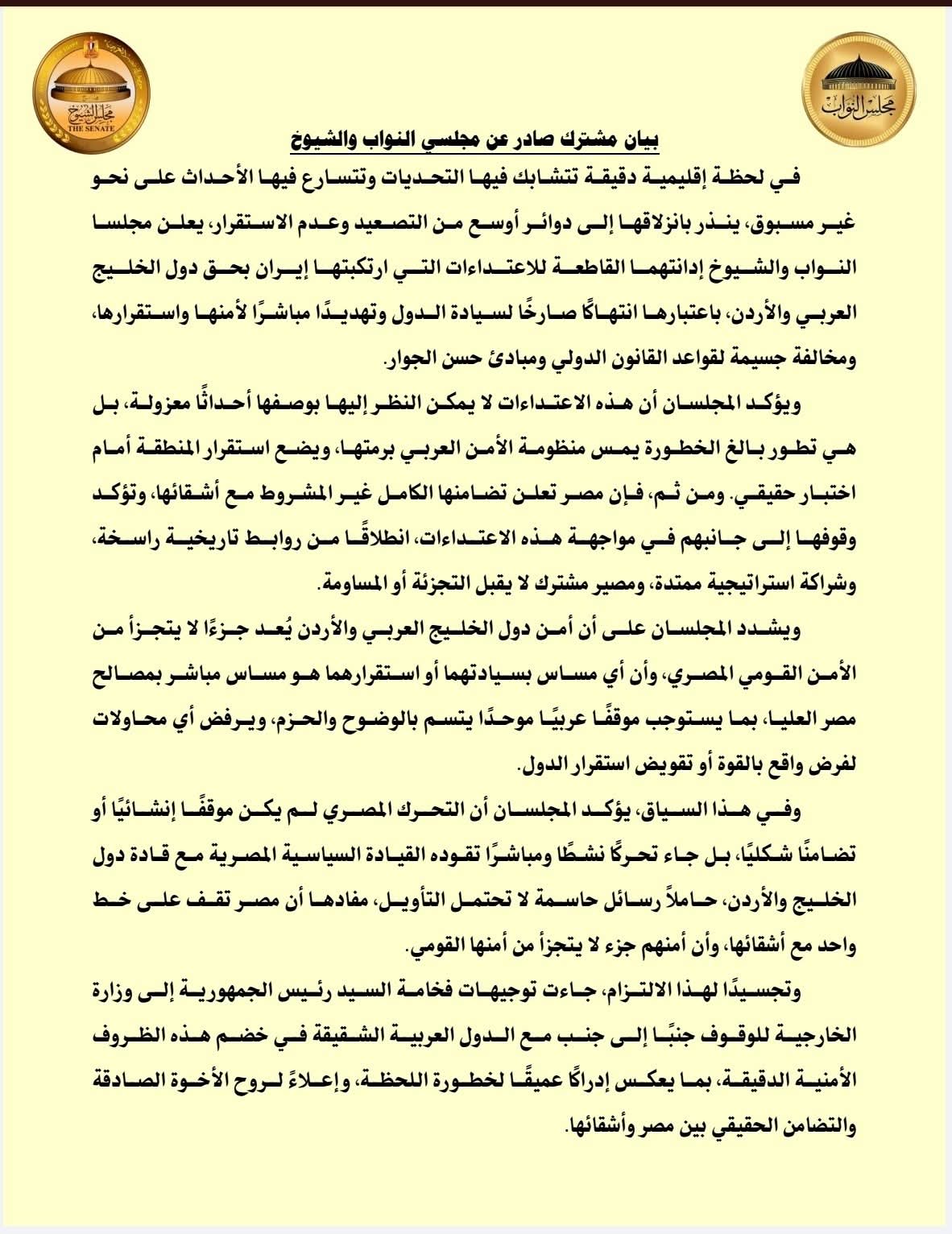 صدر بيان مشترك لمجلسي النواب والشيوخ لإدانة اعتداءات إيران بحق دول الخليج العربي والأردن ..