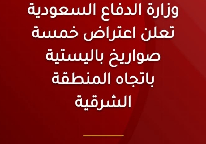 أعلنت وزارة الدفاع السعودية الاعتراض الناجح لخمس صواريخ باليستية كانت متجهة نحو المنطقة الشرقية ..