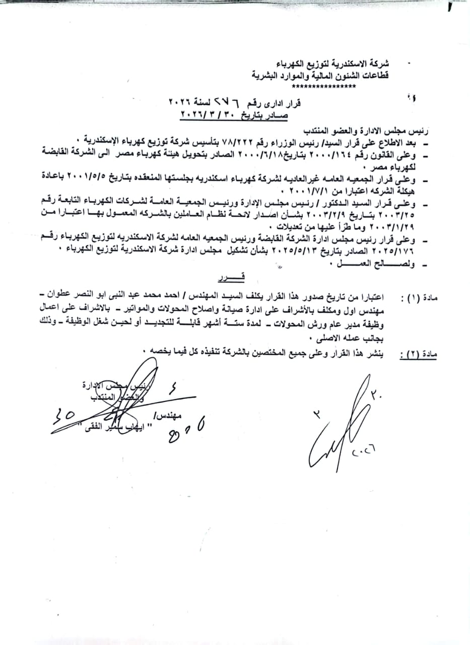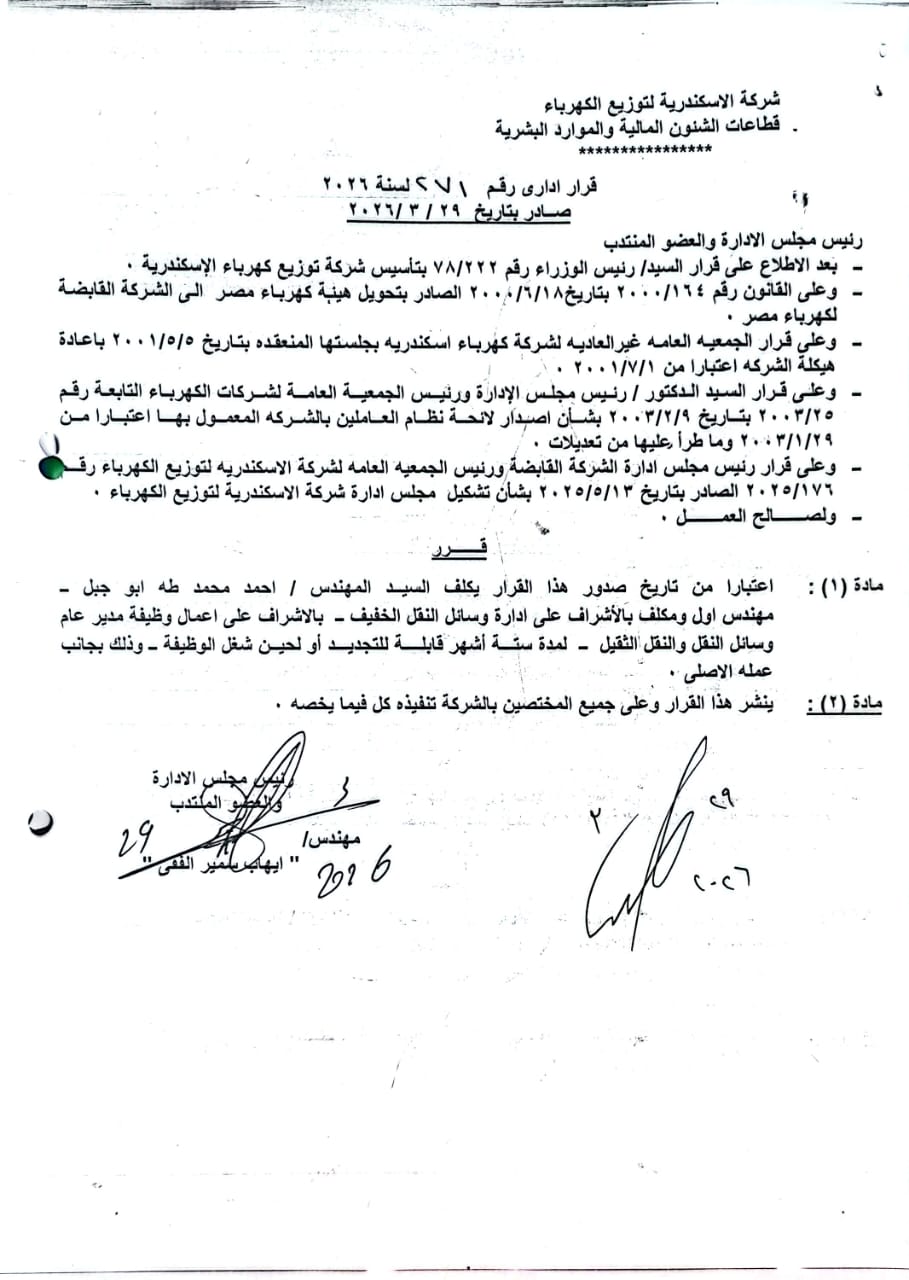 كما تم تكليف المهندسة منى أبو الفتوح القاضي مدير عام شبكات توزيع الساحل الشمالي والعجمي بالإشراف على وظيفة رئيس قطاع شبكات توزيع الساحل الشمالي وتكليف المهندس أحمد محمد ابو جبل مهندس أول ومكلف بالإشراف على إدارة وسائل النقل الخفيف بالإشراف على أعمال وظيفة مدير عام وسائل النقل والنقل الثقيل وتكليف المهندس أحمد محمد عبد النبى أبو النصر - مهندس أول ومكلف بالإشراف على إدارة صيانة وإصلاح المحولات والمواتير بالإشراف على أعمال وظيفة مدير عام ورش المحولات .