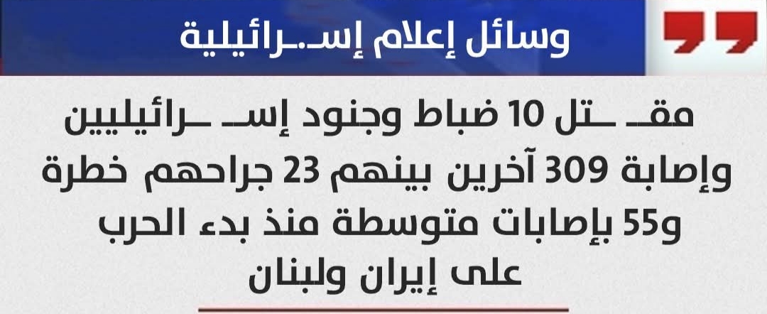 أفادت وسائل إعلام إسرائيلية اليوم الأربعاء بمصـرع ١٠ من الضباط والجنود وإصابة ٣٠٩ آخرين من بينهم ٢٣ حالة حرجة و٥٥ إصابة متوسطة جراء المواجهات المستمرة في إيران ولبنان ..