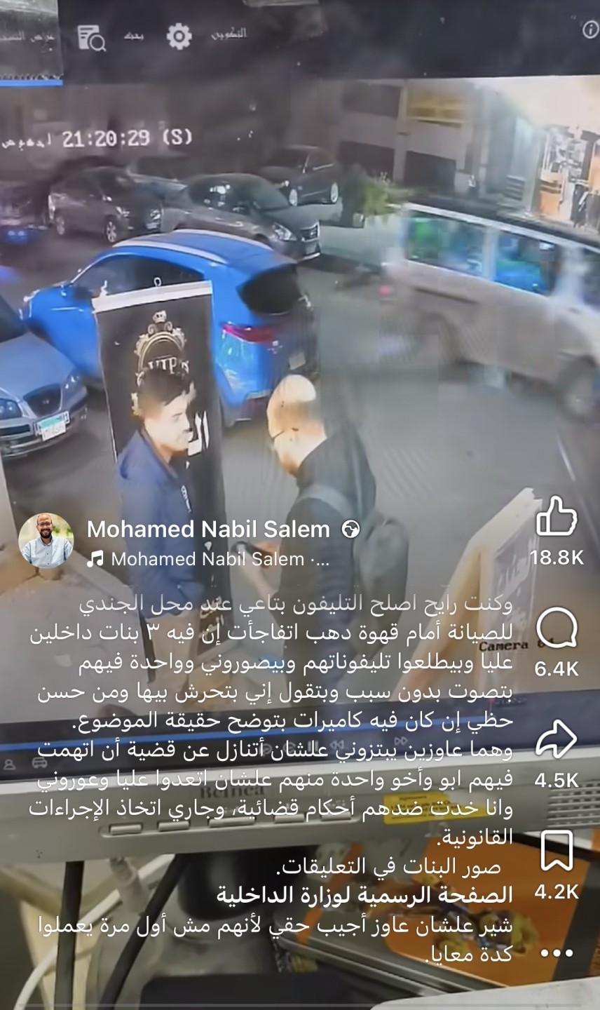 وقال الشاب عبر حسابه على فيسبوك إنه أثناء عودته من عمله وتوجهه إلى محل لصيانة الهاتف المحمول، فوجئ بثلاث فتيات يقمن بتصويره، بينما بدأت إحداهن في الصراخ واتهامه بالتحرش دون مبرر، على حد قوله.