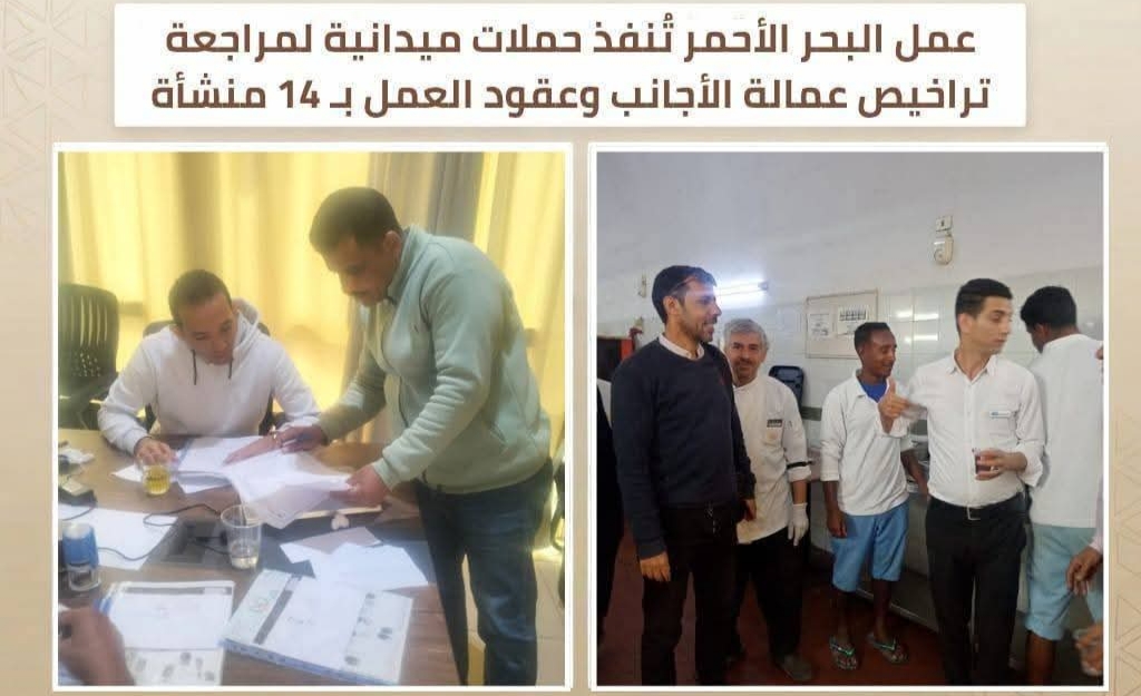 9-عمل البحر الأحمر تُنفذ حملات ميدانية لمراجعة تراخيص عمالة الأجانب وعقود العمل بـ 14 منشأة