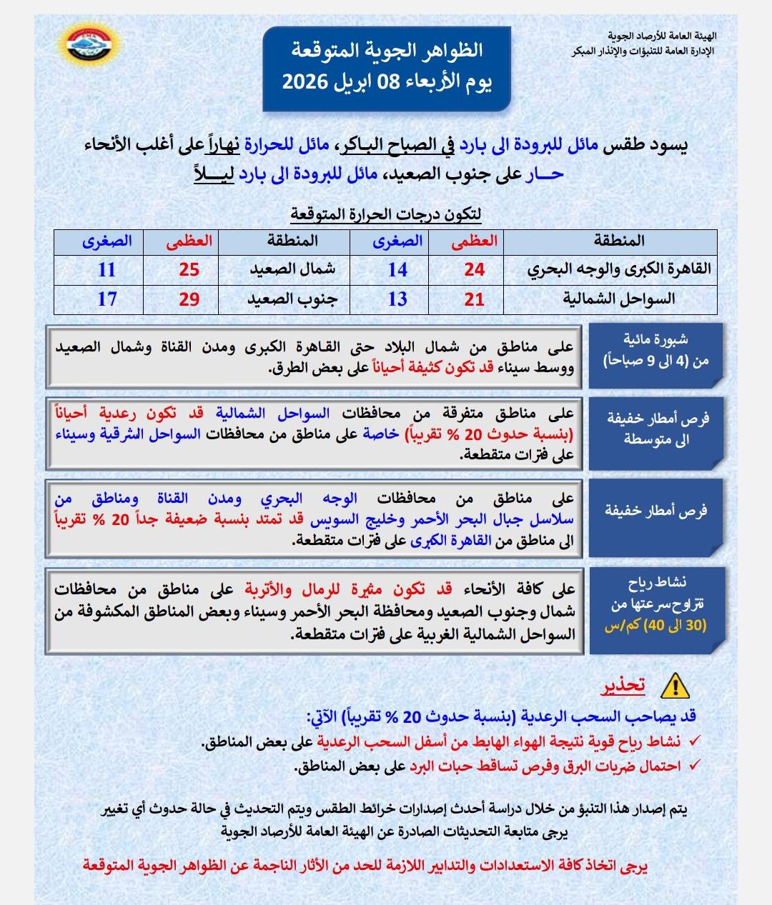 أعلنت الهيئة العامة للأرصاد الجوية عن تفاصيل حالة الطقس المتوقعة ليوم غد الأربعاء، الموافق 08 أبريل 2026، حيث تشير التنبؤات إلى سيادة طقس مائل للبرودة في الصباح الباكر، يتحول إلى مائل للحرارة نهاراً على أغلب الأنحاء، بينما يكون حاراً على جنوب الصعيد، ومائلاً للبرودة إلى بارد خلال ساعات الليل.