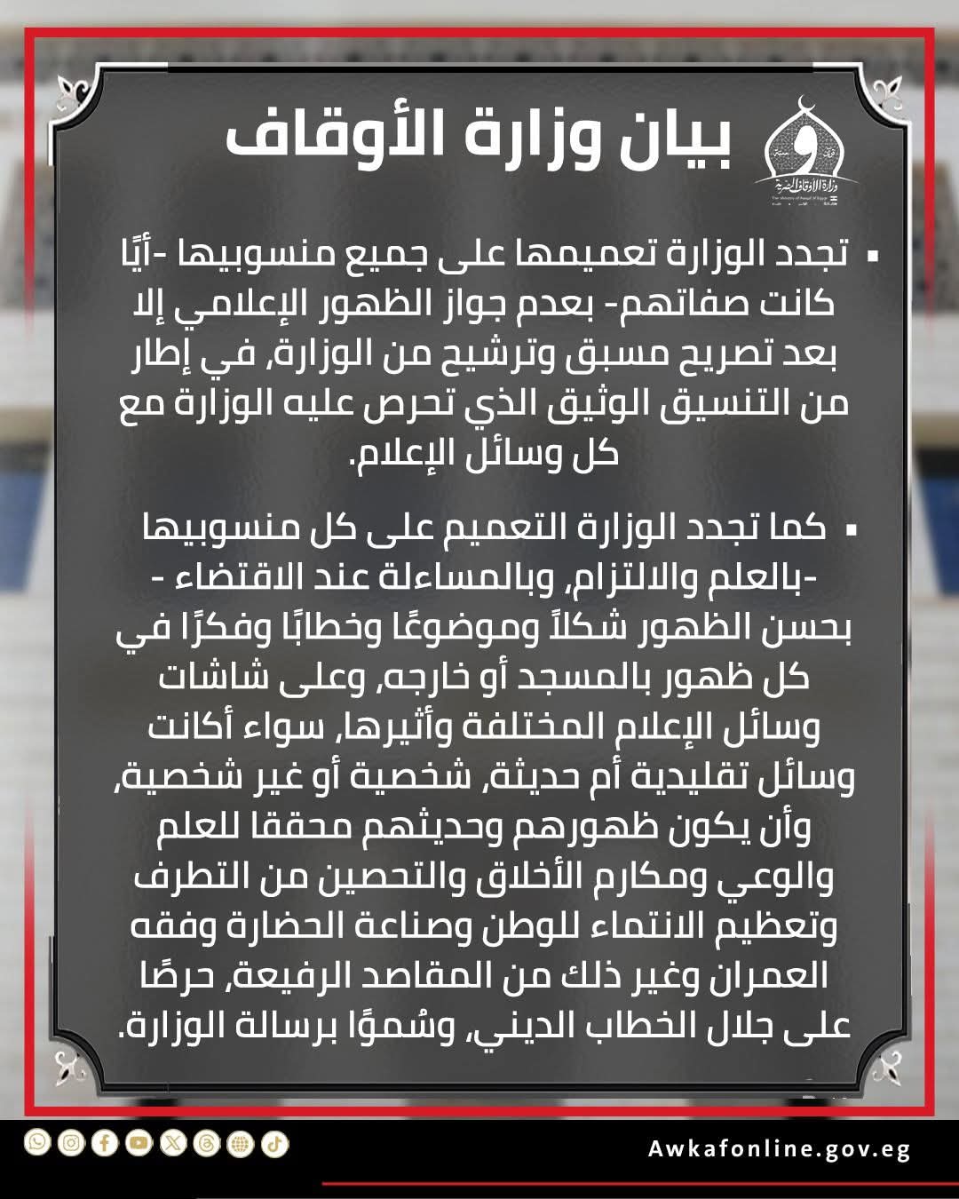 أصدرت وزارة الأوقاف بيان بضوابط ظهور أئمة وزارة الأوقاف بالمنافذ الإعلامية والقنوات الفضائية .. جاء فيه: