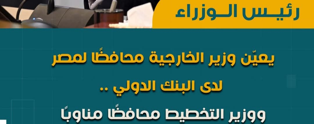كما أصدر رئيس الوزراء قرارًا بتعيين وزير الخارجية والتعاون الدولى والمصريين بالخارج محافظا لجمهورية مصر العربية فى مجلس محافظى البنك الأوروبي للتعمير والتنمية ..