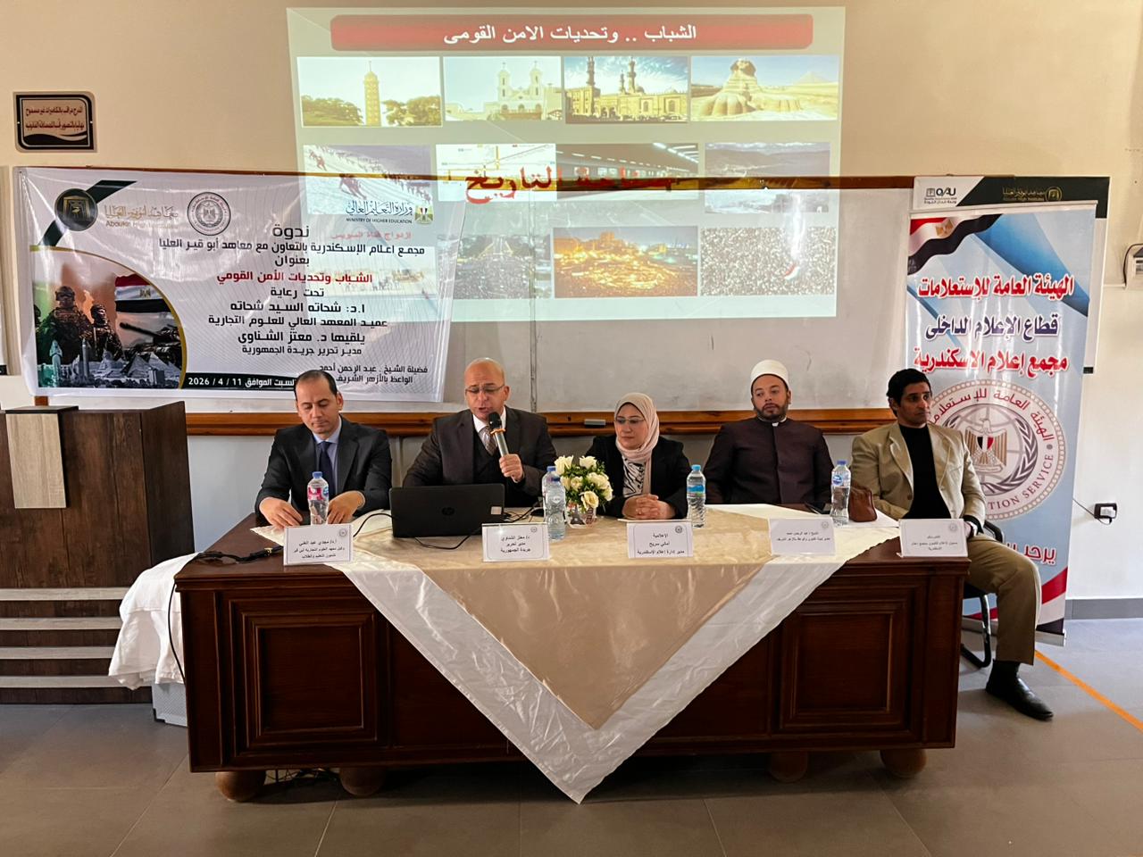 نظّم مجمع إعلام الإسكندرية التابع للهيئة العامة للاستعلامات، ندوة توعوية بعنوان «الشباب وتحديات الأمن القومي»، بالتعاون مع المعهد العالي للعلوم التجارية بأبو قير، وذلك في إطار استراتيجية قطاع الإعلام الداخلي برئاسة الدكتور أحمد يحيى، بهدف تعزيز الوعي الوطني لدى الشباب، ورفع روح الولاء والانتماء للوطن ، بحضور الاستاذ الدكتور مجدي عبد الغني وكيل المعهد لشئون التعليم والطلاب.