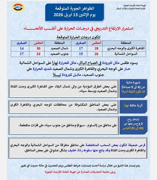 أعلنت الهيئة العامة للأرصاد الجوية عن توقعات حالة الطقس ليوم الاثنين الموافق 13 أبريل 2026، مشيرة إلى استمرار الارتفاع التدريجي في درجات الحرارة على أغلب الأنحاء.