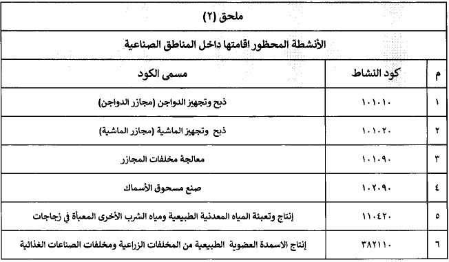 وأشار القرار أيضًا إلى حظر إقامة بعض الأنشطة داخل المناطق الصناعية، وتشمل ذبح وتجهيز الدواجن، وذبح وتجهيز الماشية، ومعالجة مخلفات المجازر، وصنع مسحوق الأسماك، وإنتاج وتعبئة المياه المعدنية الطبيعية ومياه الشرب المعبأة في زجاجات، وإنتاج الأسمدة العضوية الطبيعية من المخلفات الزراعية ومخلفات الصناعات الغذائية.
