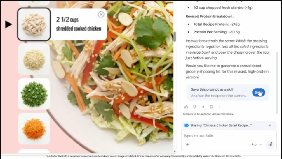 كان Gemini يتيح للمستخدمين طرح الأسئلة حول محتوى صفحات الويب أو تلخيصها أو تنفيذ مهام متنوعة، إلا أن ميزة "Skills" ترتقي بهذه الإمكانات عبر تمكين المستخدم من إنشاء أوامر ذكية قابلة للحفظ والاستخدام المتكرر بنقرة واحدة.