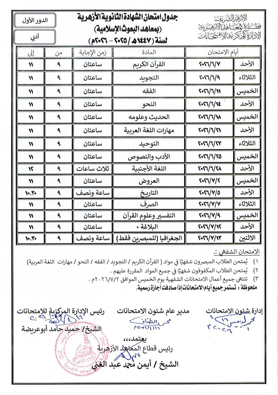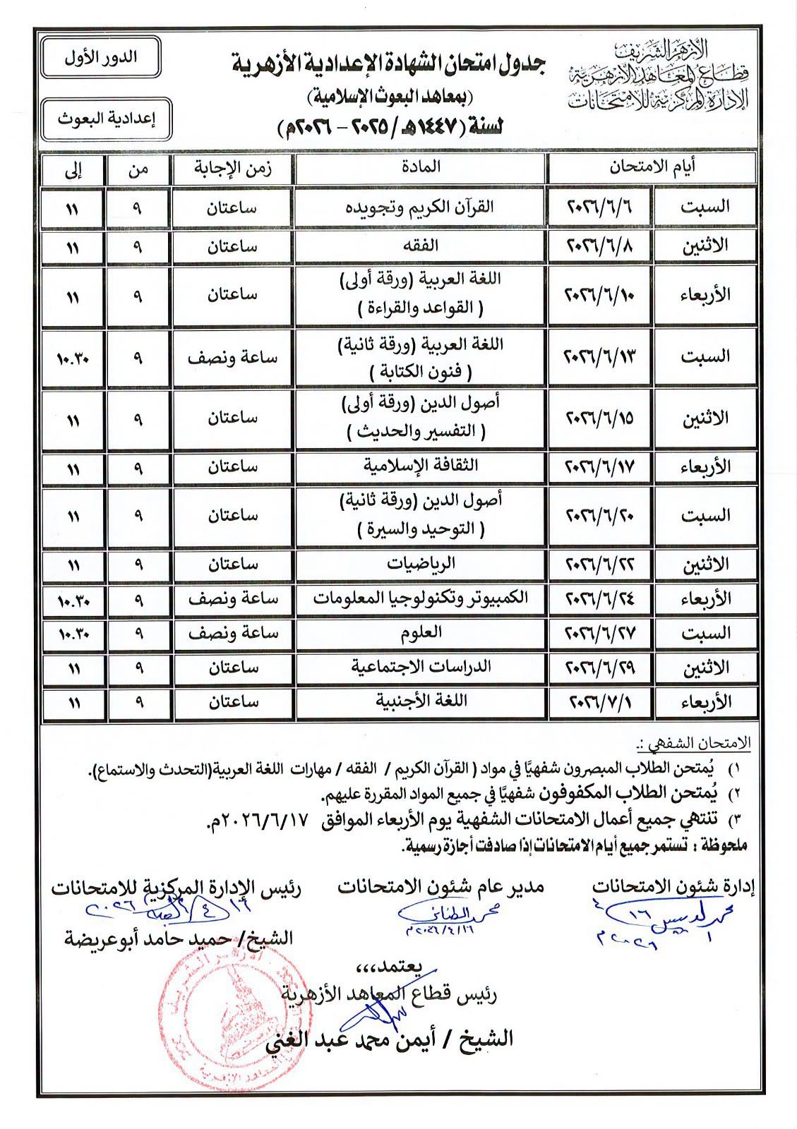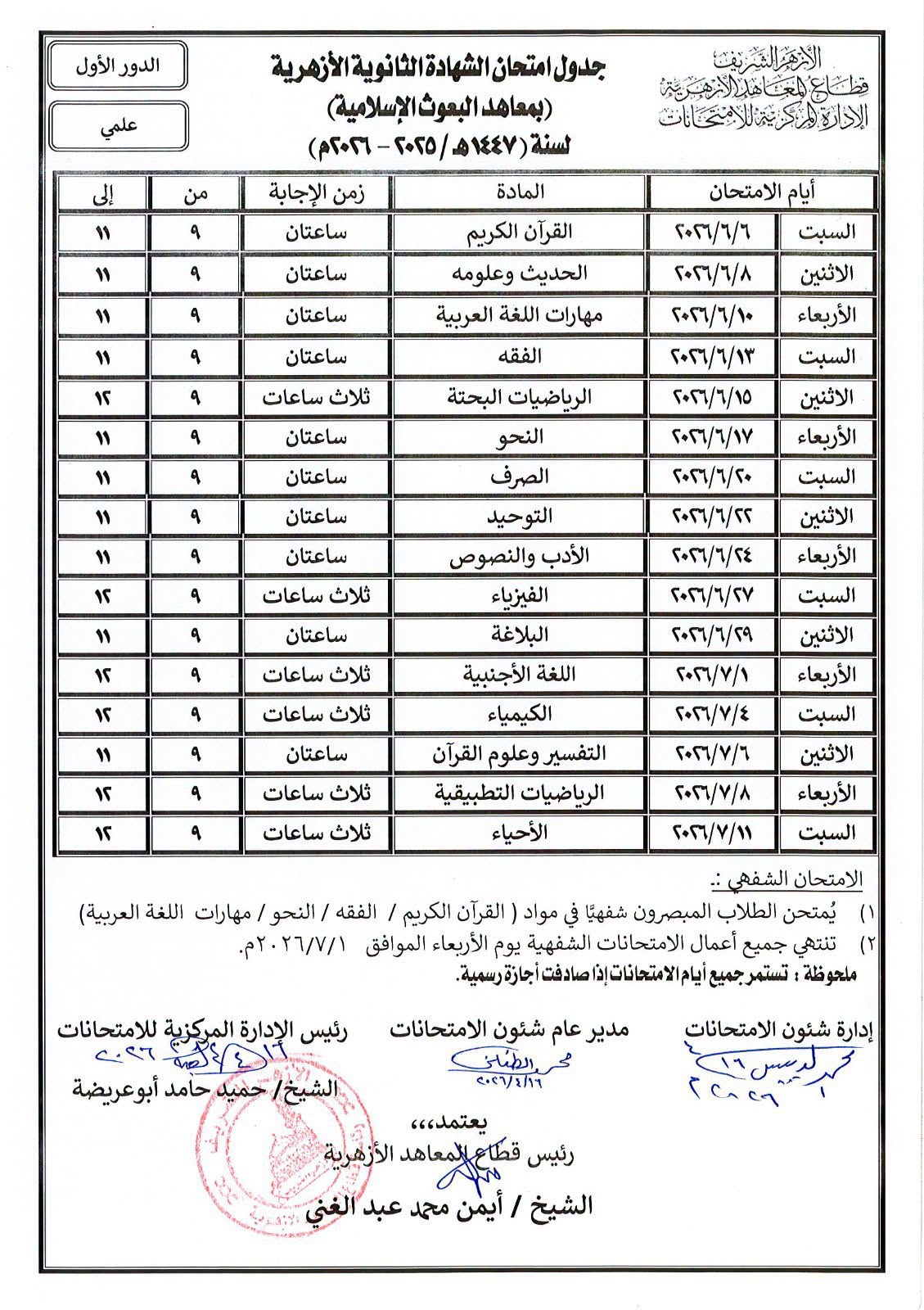 واعتمد اليوم السبت الموافق ٢٠٢٦/٤/١٨ فضيلة الشيخ أيمن عبد الغني، رئيس قطاع المعاهد الأزهرية، جداول امتحانات الشهادة الثانوية الأزهرية، والإعدادية (معاهد البعوث الاسلامية) للعام الدراسي ٢٠٢٦/٢٠٢٥م حيث قامت الإدارة المركزية للامتحانات برئاسة الشيخ حميد حامد ابو عريضة، بإعداد جداول الشهادة الثانوية الأزهرية لهذا العام.